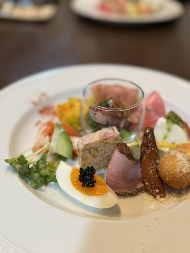 訪れること!4回目で入ることが出来ました!流石かほく市の誇るレストランの1角ですね(^^)予約は11時半の予約と12時半のニ種類のみです😃私達は11時半は取れず、12時半の予約です💕教えて頂いた今本ぶどう園で自宅用のぶどうを買ってから伺いました🍇ÀランチとBランチをお願いし、セット以外に食中のワイン🍷、ビール🍺ソフトドリンク等とドルチェも余分にお願い🙏前菜は予想通り、繊細で夏にピッタリ👍ニョッキ好きの私に赤海老のニョッキ!これがまた少しピリッと、トマトが優しく、幸せです😃メインのお肉もランチの、価格では🍀信じられない美味しさでした。勿論ドルチェもお店の雰囲気、ゲストの作る満ち足りた空気🍃シェフとサーブのマダムの包み込む優しさ✨ユックリとお店のペースに従って良き時間を有難う御座いましたm(_...