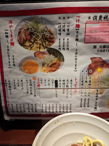 Read moreフハハハハ! 聖帝カーで何十回と通り過ぎてしまっていて、たまたまランチタイムで行けそうだったので入店した! お店の横や裏手に駐車場があり、車での来店も歓迎である。 お店の中は綺麗にしており、座敷もあるようだ。座席間も広く、感染対策もしてあるようだ。 肝心のメニューだが、あっさり系にこってり系、つけ麺もあるのか。なるほど。 トッピングも充実しておるようだな。