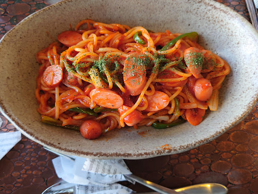私はナポリタンの サラダとスープセットを注文。 セットのサラダはドレシングが 4種類の中から好みのを選べます。 ドリンクはブレンドを注文しました。 ナポリタンはソーセージも多めで 普通に美味しかったです。