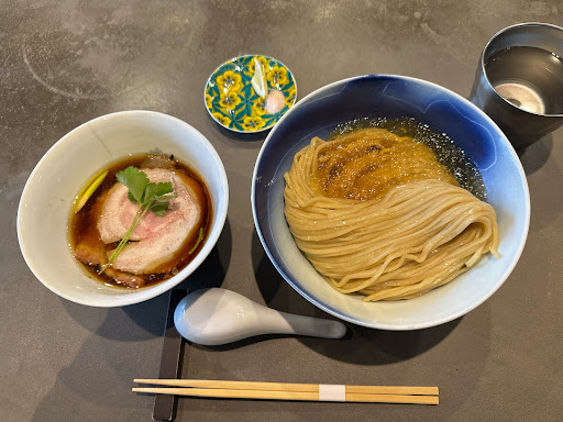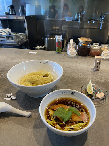 Passed by on the way back from yamanashi to tokyo: It’s worth to get out of the highway and have a quick lunch at this noodles shop. Unexpected from such a calm place the interior of the shop is very chic and bougie and so are the dishes despite being priced relatively cheap for what they are. The food is delicious and comes in big portions! (Only counter seats and around 9seats at the shop- I didn’t get a line on a Friday lunchtime). I’ve tried the 淡麗昆布水つけ麺 (kelp water dipping noodles) which is a special from The shop and it was very nice with options of lime and salt to play with the flavors. To be noted though, because the water used is made with kombu (kelp) the more you eat the more neba-neba (slime-y) it gets, almost like nattō texture, if you can’t with that the other dishes looked to be...