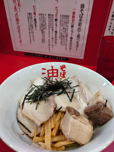 Read more最初の3口目くらいまでは非常に美味です。 まぜそばの宿命ですけど、油の味が強くて口の中が麻痺してしまうので、リセットするといいです。ネギなどのトッピング増やしましょう!