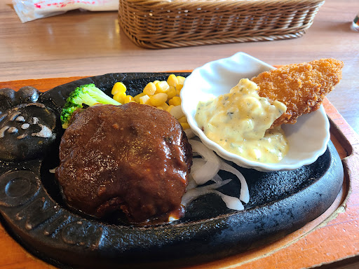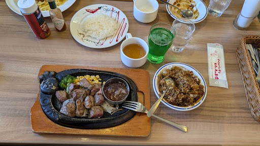 Read more駐車場あり。店舗の通り沿いから入ることもできますし、車通りが少し多い対向車線から入る場合、信号で曲がってからだと入りやすいです。 弾丸&ビフテキ&グリルチキンを注文。セットはサラダとスープバーのEセットにしました。スープバーにあったのはコンソメスープとジンジャーエッグスープの2種類でした。もしコーンクリームやオニオングラタンスープ、ビスクスープを注文したい場合は別のセットで注文できます。 弾丸ハンバーグは鉄板に乗った丸い石で焼き加減を調整できます。ビフテキはそのままでも美味しかったですし、選んだオニオンソースにつけて食べても美味しかったです。グリルチキンはトマトソースがかかってました。全体的に美味しかったです。 すかいらーくのアプリがあれば割引クーポンを利用する事ができます。またJAFのアプリがあれば割引クーポンを利用することができます。(JAFアプリの方が割引率は良いはず。) 支払いはPayPayなどのキャッ...