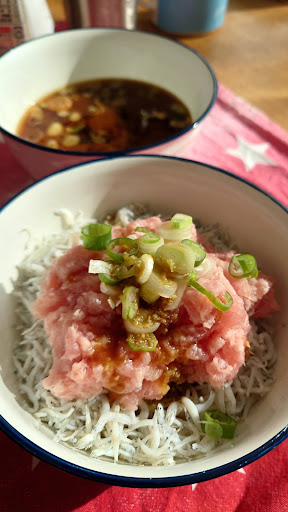 Read more日曜のお昼に伺いました。 入口の用紙に名前と電話番号を記入します。既に8組程の記入ありましたが、近辺の薬局やヨシヅヤで時間を潰し待ちました、駐車場の車中で待ってみえる人が多かったかな。 回転も早く30分弱程で入れました。 で………、海鮮丼にも惹かれましたが今日は花籠御膳(限定20食)を頂きました。 とてもお値打ちでした♪ 揚げたて天ぷらのエビも大きく白身魚もふっくら揚がっていました。 マグロとサーモンのユッケも白米に合う♪付合せの小鉢、もずくの汁物もどれも美味しかったです。鮭味噌も美味しかった〜(隣りコンテナにて購入出来ますょ) またぜひ伺う予定です、次回は天丼にしようかな、、、メニューに天丼(具たくさん)と書かれており それも楽しみです。 食後のコーヒーは+100円で頂けます。 隣りのコンテナ建物には「うなぎ」の旗が…で、鰻の蒲焼きや魚の惣菜や切身、刺身と並んでおり… マグロのたたき298円キレイな色とお値打ちさに、購入して帰りました。 しらす添えてネギトロ丼に^_^