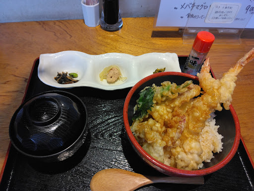 ランチがお勧めと家族に誘われてランチに来ました。予約も入っていたらしく、開店早々満席に。 メニューは天丼・海鮮丼・まぐろ丼と数量限定の花籠膳で計4種類。残念ながら花籠膳は早くも品切れだったので、天丼を注文しました。 具だくさんの名の通り、えび天が2尾と牡蠣・白身魚・白子とさつま芋とししとう、あとげそ天が入ってました。牡蠣は食べられないので連れにおすそ分け。 付け合わせの小鉢はひじきの煮物とタラコの生姜煮、あとお漬け物とお吸いものが付いてきました。 タレは甘めだけどしつこくないし、お吸いものも出汁がきいていて美味しかったです。欲を言えば、小鉢の量が本当にひと口サイズで正直ちょっと物足りなかったかな。でも、このボリュームにしては良心的なお値段でした。 駐車場は、となりの惣菜店と合わせて20台くらいあるけど店内の席が少ないので、花籠膳が目当てなら早めに入店することをお勧めします。