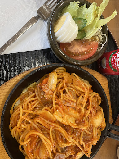 Read more店は暗くて私はナポリタン頼みました。味はあまり美味しいわけじゃなく不味くて食べれないほどではなかった。鉄板に乗ってたのはよかったかな。 そばは熱い蕎麦をお皿に乗せるスタイルでした。 味はちょっと無...
