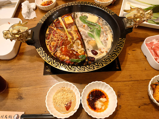 駐車場はそう広くないですが客入りがそもそもあまり無いので入れると思います メニューは2つありますが実際には最初に羊の骨肉を入れるかどうかの選択制です 出汁は3種類から2種えらべるやつで、金の豚と同じ手法です 私は火鍋というものを食べたことがなかったのですが、ここの火鍋は実質辛いしゃぶしゃぶです 辛い火鍋用の出汁は1辛で辛いの苦手な私でギリギリでした店員さんがしばらくすると来て辛そうなら辛いところを除去するか聞いてきてくれたのでお願いするとだいぶ食べやすくなりました さっき書いた羊の骨肉を頼むのは正直女性にはオススメできません。 理由はまずめちゃくちゃ食べにくいこと(リブロース的な部位なのかとても油が多いので滑りやすい為に手でしっかり持てない、やたら手がベタベタする、ポリ手袋を店員に言うとくれるがそれでも食べにくい) 量が多い(1人あたり唐揚げ7つ分位の肉量)羊の骨肉を食べ終わる頃には結構お腹に溜まっていました あと味付けが適当すぎて意味不明になってしまっている
