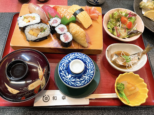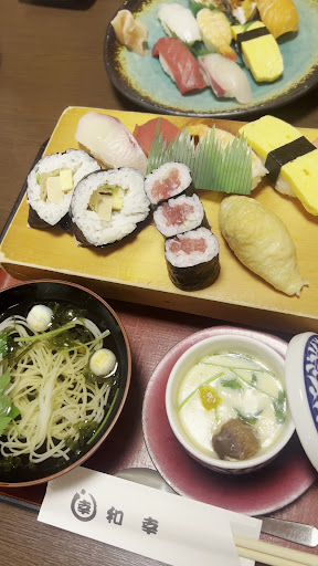 Read more気軽に入れる コスパの良い 止まる寿司屋さん😄 と 言う感じですネ❗ 店の裏手に10台以上は停めれる🅿有ります。で、裏口を通過して 入口へ向かう感じです❗ 店内は、職人さん 大将もいれて3名か4名! 店内廻しの女性の方も3人居てたか! ランチで伺いましたが システムが良く解らず、目の前のメニュー に 店の名前が入った『和幸ランチ』1,800円をお願いし、待つこと暫し、春巻サラダ登場(パルカッチョ風でインパクト有り)天ぷら登場(揚げたてサクサク♪)吸い物(出汁が旨い)とお寿司登場(ポン酢をムースにしてある等凝ってる!)で 、食べてる間に 茶碗蒸し登場、食後にシャーベットアイス 登場でした😄 私共の口に すこぶる 合いました😋 もっと リーズナブルなランチも有るので 近くを通り掛かったら 頻繁に寄せて頂きたいと思いました😄「ご馳走さま」と 店を出るときも 全員で愛想良く...