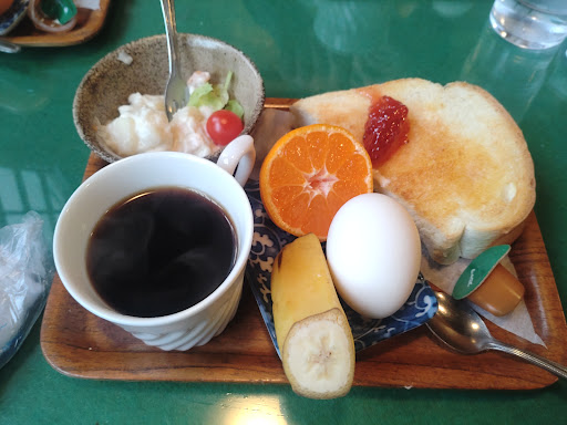 ・珈琲 ・トースト ・サラダ ・フルーツ ・ゆで卵 ・お団子 ・昆布茶 400円