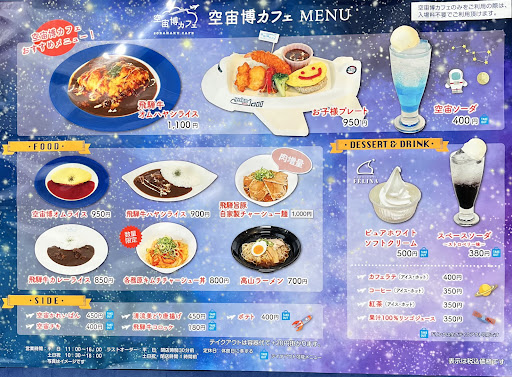 Read more”岐阜かかみがはら航空宇宙博物館”内のカフェレストラン。 場所は1階エントランス入ってすぐ、左側。 空宙博カフェだけ利用する場合は入館料不要です。