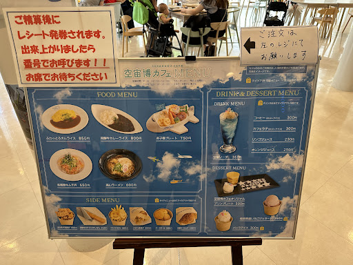 かかみがはら航空宇宙博物館の建物の中にあります。フロアはあまり広くはないです。カウンター席っぽいところとテーブル席があります。お昼時には遅い時間でしたのでお客さんは少なめでした。入口入って程なくタッチパネル式の自動食券販売機があります。ただこの販売機がこれまで見たことのない操作感で、操作終了までだいぶ戸惑いました。今回注文したのはオムライスとロケットかれいぱんとコロッケです。時間が遅かったので売り切れの品物もありました。基本セルフサービスで、水などは給水機で、料理などは注文した時点で厨房に連絡がいくようで、レシートに記載された番号を後で呼ばれます。呼ばれた際に受け渡し用のカウンターにて料理などを受け取ります。食べ終わったらトレイなどを返却用の棚に置きます。なにぶん食券の購入からして一般的とは言えないので、慣れてないとスタッフさんにたずねるこ...
