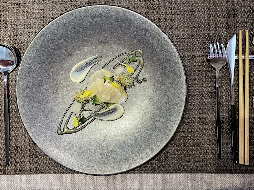 前菜はヒラマサのタタキ、夏っぽい構成のお野菜とソース。 パンは白パンと全粒粉の2種類、バターではなくクリームチーズのスプレッドつき、冷めてもふわふわで美味しい。