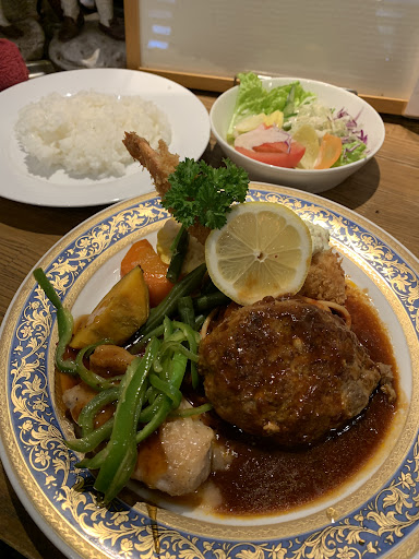 ハンバーグ、海老フライ、魚フライ、他一品にサラダとスープが付きます。 パンかご飯は選べます。