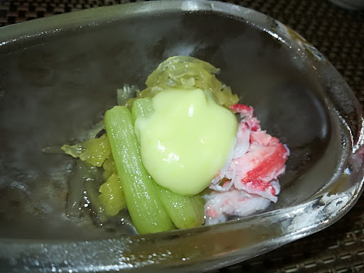 注文したのは昼懐石2500円 ①ズイキと糸カボチャと蟹肉にアスパラのソースがけ ②トウモロコシの枝豆入真丈と茗荷 ③お刺身2点(ブリとタイ) ④飛竜頭(?)の鮎巻 ⑤茶碗蒸し(玉子多め) ⑥天ぷら(海老・ミニコーン・アボガド) ⑦御飯・赤だし・香物 ⑧胡麻プリン黒砂糖ソースかけ ★お茶は熱い番茶