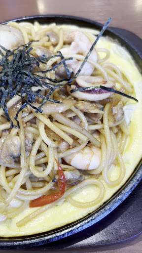 初めてです、と店員さんに伝えると 丁寧な説明をしてくれました 年齢層高めな落ち着いたが多かったね 期間限定で、海鮮醤油スパゲッティ 10月のみ 入店までは鉄板ナポリタンにしようと思っていたのに なぜか心惹かれる❤️ 全部メニュー見たけど 海鮮醤油スパゲッティに決めた