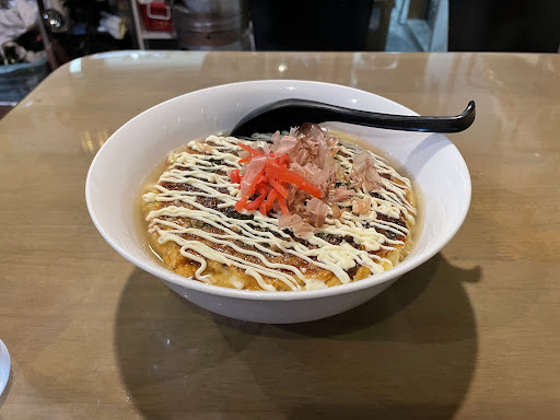 Read more数日前から気になってたので来ました お目当てのお好み焼きラーメン(と手羽先)を注文 ここで注意1 お好み焼きラーメンは作るのに少し時間かかるみたいです (そりゃラーメン作ってお好み焼きも作ってるから) 僕はたまたま手羽先頼んだのでそれが先に来て 時間繋いでました そして来ましたお好み焼きラーメン 第一印象はお好み焼きに何故レンゲがあるんだ? という違和感からはじまりますが気にしちゃイケナイ そして店主のレクチャー通りにお好み焼きを1/4食べて→塩ラーメン→スープが染みたお好み焼きと食べていきます うまい、語彙力少なくて申し訳ないけど本当にうまい 特に後半からの塩スープに浸したお好み焼きが 明石焼きに近いものになってマジで美味いです ここで注意2 単純にラーメン1人前お好み焼き1人前なので それなりにお腹貯まります(お腹すかせて行きましょう)