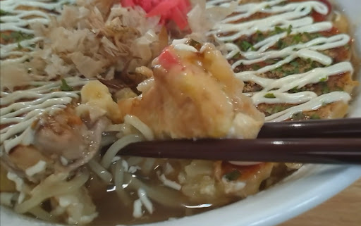 お好み焼きは、めっちゃ具沢山で美味しい 豚肉 や キャベツ も ちゃんと入っています これは、絶対に単体で食べても 美味いヤーツ です 分厚く焼き上げられたお好み焼きに、だんだんとスープが染み込んで、フワフワと柔らかく、また 別の味わいが楽しめますよ