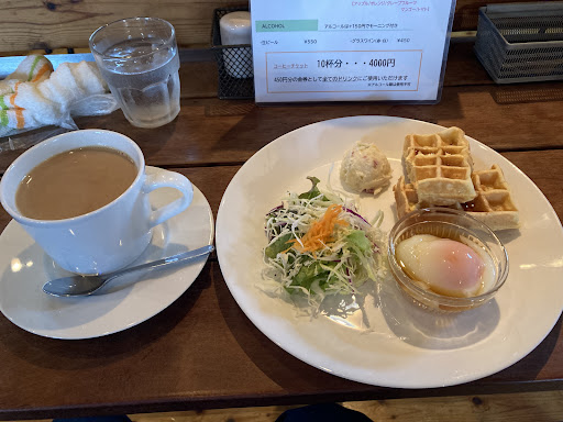 Read more久しぶりにモーニングに伺いました。 変わらず、ログハウス調の店内で、おしゃれ。 晴れの日はデッキで過ごすことも可能。 モーニングはトーストかワッフルを選べます。ほとんどの方が、ワッフルを選んでいる印象です。 店内はBOSEのスピーカーから音楽が流れていますが、ログハウス調なので話し声が響きます。また、ミスター・ビーンの映画がディスプレーに繰り返し流れており、笑えます。 コーヒーの味は独特です。好みが分かれるところ。 支払いは現金のみ。