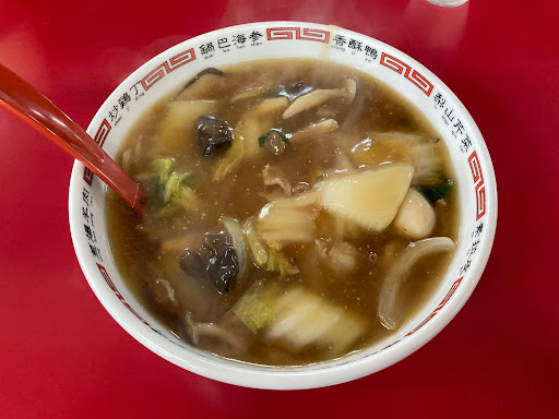 さて、宝龍といえばいつもは「タンメン」なのですが、この日は広東麺とギョーザをお願いしました。 待っているとまずは広東麺が到着です。 たっぷりの野菜あんかけで、これぞザ・広東麺!って感じですね。 アツアツで火傷をしそうになりながら美味しくいただきます。