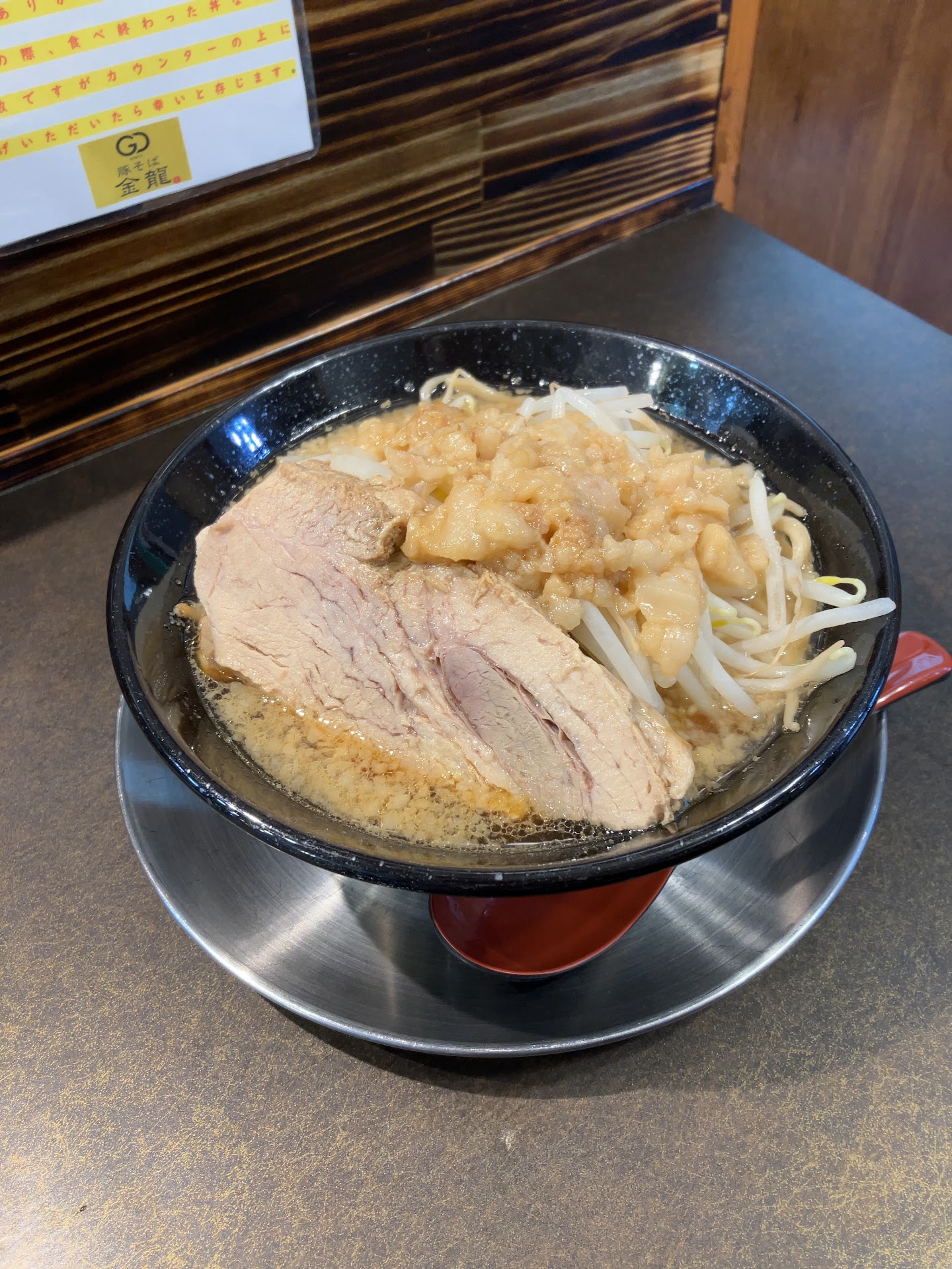 Read more最近二郎系ラーメンにハマり、朝から金龍さんへ初チャレンジ。 店に入ると店長さんや従業員さんも気さくな方で、二郎系特有の頼みづらさは全くありません。(むしろ頼みやすかったです) 店内は会話の内容からすると地元のお客さんが多い感じです。 オーダーはチャーシュー豚そば(小:麺200g)ニンニク少なめ、ヤサイマシ、アブラマシマシで、トッピングにうずらの卵とチャーシューをプラス1枚注文。 いざ、ラーメンが着丼するとものすごいボリュームのラーメンで驚かされました。 ボリュームが凄すぎるため、店長さんが「別皿いる?」と聞いてくれたほど。 他の二郎系ラーメン系にはにはあまり見られない気遣いもあってとても嬉しかったです。 いざ、圧巻のラーメンを食らうと大量のアブラと野菜が絡み合ってめちゃめちゃ美味しい! チャーシューも肉厚で柔らかくて食べやすく、肉好きな僕にはたまりませんでした! やっとの思いで麺にたどり着くと、なんとそこにはちぢれ麺ではなく、太ストレート麺で登場。のどごしが良く、ツルツル食べられました。 スープを飲んでみるとちょうどいい味で、大量のアブラと絡んだおかげか微乳化してとてもマイルドで美味しかったです...