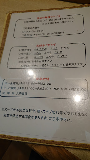Read moreつけ麺が有名なラーメン屋さんで、とにかく大食いの人にはオススメします。一番安い醤油つけ麺700円で、麺1.5玉か2玉無料、野菜(もやし、ほんの少しキャベツが入っている)多め無料、ランチタイムに小ライス無料のサービスがあり、麺の固さ、味の濃さ、油(せあぶら)の量を選ぶことが出来ます。メニューも結構あり普通のラーメンもあります。...