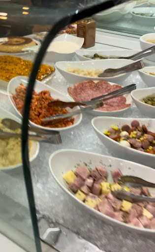 Read moreQuando chegamos não havia ninguém para nos receber, entramos e sentamos em uma mesa que já estava reservada para nós. Esperamos 45 minutos até que alguém viesse pegar nosso pedido. O buffet era lindíssimo e parecia delicioso, mas infelizmente tudo estava muito salgado (exceto a farofa, coxinha, arroz japonês e as saladas). As carnes do rodízio eram também muito salgadas (exceto a costela de boi que foi servida de forma estranha, em um pratinho. Era branca com muito líquido, não entendi) Os doces eram lindos, mas o pudim tinha a calda amarga como qdo passa do ponto e queima, mousse de maracujá era estranho, tinha uma consistência boa e aparência também, mas o sabor eu não consegui identificar, era ruim. O arroz doce era okay. Como opção de bebida havia sucos, guaraná de latinha e água de coco de caixinha. O guaraná era bom. Na saída o rapaz não cobrou o rodízio da minha filha (3 anos) e me deu de brinde um vidrinho de molho de pimenta que experimentei em...