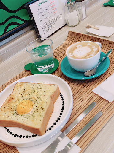 モーニングも何種類かあって、¥500+αで好きな飲み物に変更出来たり、ヨーグルトやサラダ付けたり、アーモンドトーストにしたりとか出来るみたいです。私はマヨたまトーストのモーニングに+料金でカプチーノに変更してもらいました。友達はトーストのモーニング(ホットコーヒー)です。 カプチーノはかえるのラテアートで凄く可愛い!朝から気持ちが上がります。マヨたまトーストも美味しかったです。