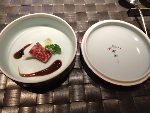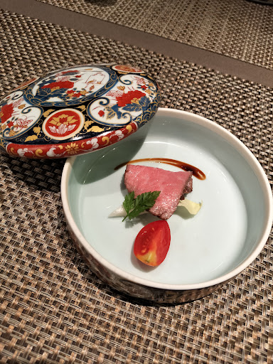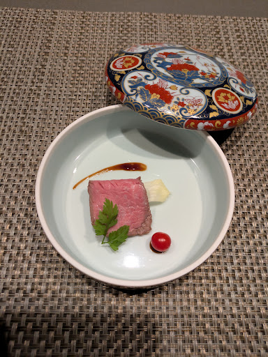 座席数も少なくゆったりと食事がいただけます。サービスも良く、付かず離れずの距離がかえって心地よく楽しい雰囲気で食事が楽しめました。ステーキに至るまでに数々の品が出てきます。どれもきれいに盛り付けられ、フレンチの要素もふんだんに盛り込まれた見た目も綺麗で楽しくなる一皿でした。ステーキは神戸牛が提供されます。焼き加減を尋ねられませんが、こちらから申し出れば気持ちよく対応してくださいます。フィレ肉が柔らかく、とても美味しかったです。ステーキそのものには味はなく、醤油味の玉ねぎソース、刻みわさび、赤ワイン塩が提供されます。最後のデザートは桃のソルベをフルーツパフェのように盛り付け、最後まで美しく美味しかったです。座席も少なく人気...