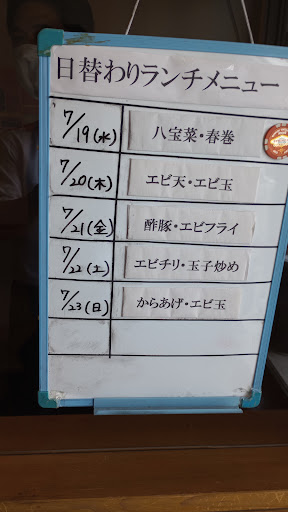 Read moreサービスランチが税込み650円で、非常にお得です。サービスランチは日替わりで、メインのおかず、サブのおかず、漬物、ライス、卵スープが付きます。メインのおかずが唐揚げや海老天などのときには、キャベツの千切りやポテサラも備え付けてあり、結構ボリュームがあります。特にエビチリやエビ玉など、エビが入ったランチが多く、エビ好きにはオススメです。何か特別にエビの入手ルートがあるんでしょうか。 自由に使える調味料として、使い切りマヨネーズのチューブがあるのもポイント高いです。醤油、お酢、餃子のタレ、カラシ、塩、胡椒など一通りあります。できれば唐揚げ用のマジックパウダーみたいな調味料と、ドレッシングも欲しいです。 サービスランチの提供時間もかなり早く、注文してから1分くらいで出てきてびっくりすることもあります。ある程度先に作ってるんだと思いますが、熱々のヤツが出てきます。 駐車場が道を挟んだ向かいにもあり、結構な台数を駐車可能です。 ただ、人気があるのでお昼は並んでることが多いです。 今までエビチリを旨いと思ったことが無かったのですが、ここのエビチリを食べて好きになりました。 以前、古い店舗の時は、全部入りの中華ランチばかり食べてましたが、新しい店舗になってからはドリンクバーが付いて、おかずが減って価格が上がったと思います。中華ランチを食べる客層はドリンクバーなんか求めてないと思うので、50円アップか100円アップでドリンクバーをオプションにしてもらいたいです。貴重なお昼の時間にゆっくりドリンクを楽しんでる余裕などないですので、、しかも、ほとんどの...