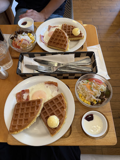 こじんまりとした、静かなお店で雰囲気もよかったです。 ほとんどのモーニングが500円か、550円でコーヒーにワッフルやトーストなどにサラダ、目玉焼き、ヨーグルトがついてきます。