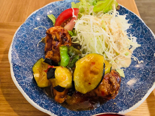 今回のランチメニューの中の茄子と鶏ムネ肉のチリソースをオーダー✨✨ 売り切れ次第終了との事ですが、15時までランチタイムとはとっても有難いです✨