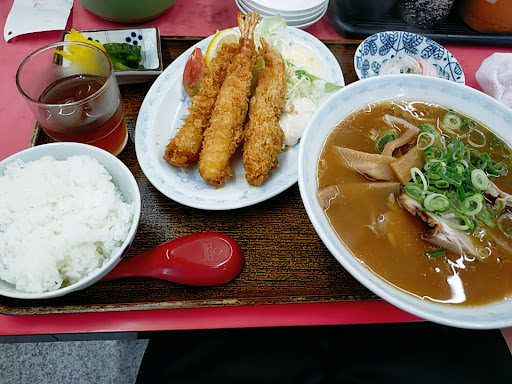 平日限定日替わり定食(エビチリ)¥980-。14:00過ぎての昼食で、訪店しました。この時間でも、ほぼ満席ですが、待たずに席に着けました。 ラーメン¥800-+¥180-でエビチリ、小鉢、ごはん、お漬物です。 醤油ラーメンは、肉厚チャーシュー2枚、もやし、ネギとメンマがトッピングされています。エビチリはタップリの餡にプリプリのエビが5尾、小鉢はすき焼き風ネギと糸こん、キャベツにタップリマヨネーズ。 ごはん、スープは、おかわり自由です。(ごはんをおかわりしたら、丁度炊き立てで、ラッキーでした。) お腹一杯。ご馳走様でした。 ちなみに、お客さんが、お店の奥の席から、立って大声で、「オバチャン、オバチャン、オバチャン」と連呼して、おかわりの注文のしてたけど、テーブルには、各席に呼鈴を備え付けているし、女性に対して「オバチャン」と呼ぶのは、親戚の子かよその人なら、百歩譲っても中学生位まででお願いしたいです。