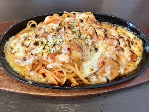 「海老のスパゲッティグラタン」、いつものもちもちの麺にグラタンで蓋された感じで、汁気も多いので若干スープパスタっぽくもある。エビは多めで、チーズもしっかり入ってます。とってもおいしい冬のメニューでした。麺の量はあるので、ボリューム多めです。