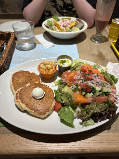 さてメニューですが注文したのはシュリンプココナツカレーとコナズ農園パンケーキ。2品で3000円ほど。お店の雰囲気なども合わせれば妥当なお値段です。ココナツカレーはココナツの甘さがふんわり広がるスパイシーなカレーで食欲をそそられます。ライスは少し食感固めで咀嚼をすることでカレーとのマリアージュを楽しめました。パンケーキは甘さ控えめの軽いコーヒークリームと香り豊かな削りたて豆がパンケーキにマッチしてとても美味しく頂きました。旦那と二人でどちらもシェアしましたがとてもお腹いっぱいになる量でした。