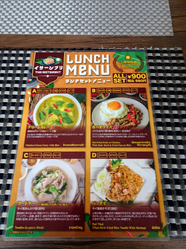 以前から前を通っていて、気になっていたお店イサーンブリさんに妻と2人、土曜日のランチで伺いました。玄関ドアを開けると、靴を脱いでスリッパになるよう書いてあります。こちらのお店は、タイマッサージ屋さんと併設されており、建物の入り口は共通になっています。改めてお店の入り口を開けると広々とした店内には、先客は誰もいません。失敗したかな…等と思っていたら、奥から女性店主?がニコニコした笑顔でいらっしゃいませーとお出迎え。流石、微笑みの国。どうしてタイの方の笑顔ってこんなに素敵なんでしょう?という訳で窓際に着席。因みに退店までに5組の来店があったので、たまたま先客がなかっただけかも。