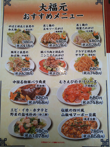 This restaurant is part of a chain. We decided to come here for lunch as we have been to one of these restaurants nearer to our home and found the food was nice. We kept our fingers crossed hoping the food would also be nice here. It got busy as soon as it opened and we were lucky to get a table but had to sit on the tatami. We ordered クラゲと胡瓜のサラダ、むきえびのチリソース、海鮮と野菜の塩味あんかけ焼きそば。The menu seems to have a big selection and the menu itself looks like a novel!