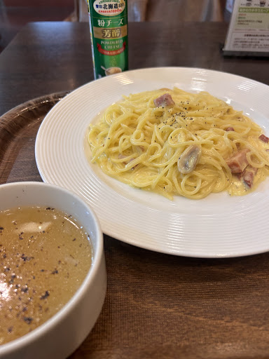 Read moreこっちも酷いです。 朝そばうどんまだやってるんだ!と頼んだら「9時で終わったので880円です」カフェのきつねうどんにそんなに払いたくないし、いつも提供がとてもとても遅いから、また遅いと困るので、「朝そば終わってるならこの紙剥がしてくださいよ紛らわしい。」と申して別のパン系メニュー頼んだら何故かトレーにレンゲが乗ってて「コレは何のために?」「おうどんにお使いください♪」「朝の値段じゃないからおうどんやめてパン注文しましたよね?覚えてます?」レシートには注文通り。 バイトさんは頑張ってるんでしょうけども。 ホントにいい加減にして欲しいです。 私が言った後も朝そばうどんの宣伝の紙は1枚も剥がされず。 まだランチタイムじゃないけどランチの幟も見えてる。 この日のコーヒーは煮詰まりすぎてて不味くて3口以上飲んだら体おかしくなりそうで残しました。 地元企業が頑張ってるのは応援したいのに、料理の味も悪くないのに、いろいろ残念が過ぎてもう応援するの...