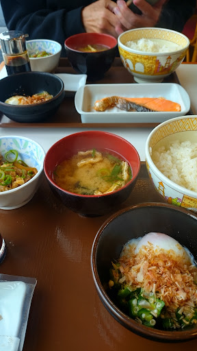 ランチ時にはまだまだ早い、病院が意外なほど早く終わって、もちろん朝食はいただいている。はてさてどうしたものか…と思い悩んだ時、そういう時には、大手牛丼チェーン店の朝食メニューが向いているだろう。この日は『すき家』さんに出向いた。 「鮭まぜのっけ朝食」(390円・税込)をモバイル端末からオーダーしました。ご飯にみそ汁、鮭フレーク、オクラの刻みに温泉玉子、かつをぶしパックが付いてきます。鮭で軽くご飯をかっ込み、残りを刻みオクラと温泉玉子の椀に、かつをぶしを投入し醤油を回し入れ、軽く混ぜ和せて残らずご飯にぶっかけて、むしゃむしゃとパクついた。 あまり品の良い食べ方ではないですが、こんな食べ方が一番...
