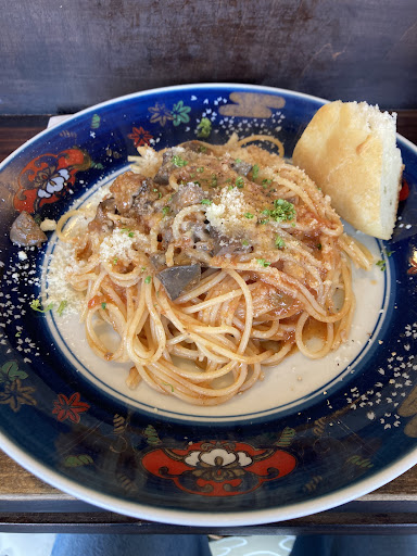 メインのパスタは、細めのスパゲティーに 具材のスルメイカとお魚の旨み トマトソースがしっかり絡んでいます。