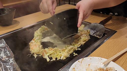 We ordered a few options of monja, okonomiyaki, yakisoba, teppanyaki and all of them were delicious. The edamame was surprisingly tasty. Portions were generous. Kids had their own bowl, staff supportive and friendly. Note only some dishes were made at our table, some were delivered hot and premade (newly cooked by chef in kitchen) for efficiency. Prices were reasonable, generous seafood portions.