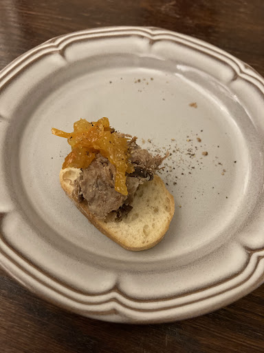 ◼️アミューズ →湘南ブタとシカ肉のリエットです。 ブタとシカ肉がマーマレード風味に味付けされてバゲットの上に乗ってます。ワインが早速欲しくなります。