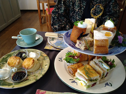 Read more鎌倉山の住宅地に30年以上の歴史を刻む英国風カフェ。 白いペンキで塗られた明るくラスティックなサンルームでアフタヌーンティーを頂きました。2段のティースタンドの上段は3種類のボリュームのあるケーキとヨーグルト、下段はサンドイッチ、キッシュ、サラダが配膳され、スコーンは別のお皿でした。量的には午後4時と言わずランチタイムの方が日本人に合うかも知れません。中でも、コーンウォールやデヴォン州で有名なクロテッドクリームとブルベリージャムをつけて食べるスコーンは、米国生まれのチェーン店の物より遥かに美味しい。本場同様のスコーンを見ると頭の中にBBC...