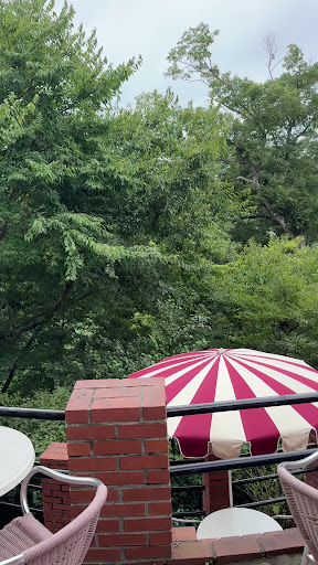 ずっと北鎌倉からハイキングコースを家族で歩いてきて、 突然現れた、山の中のカフェ。 白と赤ストライプの、大輪の花というべきパラソルがそこかしこに花開き、 緑の中に、日本離れした、 レンガ積みの壁と道が広がる…。
