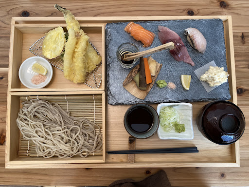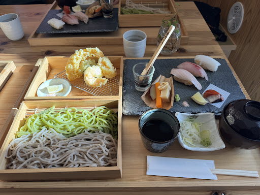 We ordered the soba, tempura, and sushi sets. The sushi was absolutely perfect - soft, the fish was sweet, and we loved how there was a brush to gently add soy sauce to the fish. The tempura was also fried perfectly, and the soba had a really good chewy texture. The set was a very reasonable ¥2,300.