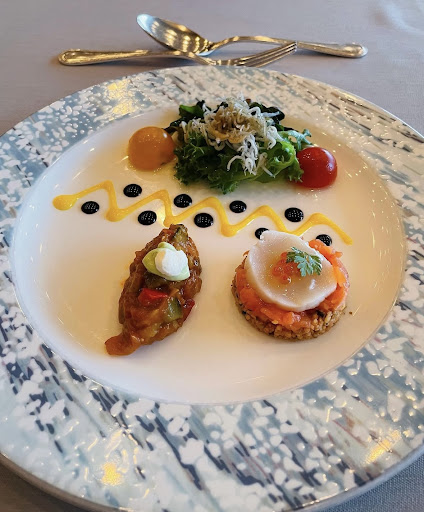 *帆立とスモークサーモンのタブレ 冷製ラタトゥイユとしらすサラダ