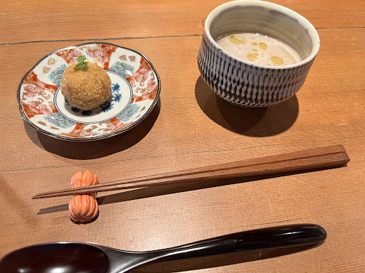 Meals are served in courses. The mushroom soup was diluted with dashi stock and flavored with truffle oil. The croquette that came with it was thick, so it had just the right consistency and was delicious.