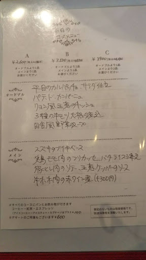 Read more2023.4 ホワイトアスパラ美味しい。旬です。 週1で通うお気に入りに。食後酒のリンゴ酒が最近のブーム。人気なので予約が安心ですが私は1人なんで1時過ぎのカウンター狙いで毎度突撃。ランチでも気軽にワインの飲める良い店です~。 ジェラートが美味しいので夏に向けて引き続き通いたいです。 日曜日13:45にランチで訪問。カウンターが空いててすぐ入れました。ランチB3500円(オードブル2品、メイン、飲み物。ランチAは2600円(オードブル1品))と白ワイン、ロゼワイン、デザート(+660円)を注文。ボリュームありますから、ランチAでも十分かも。こちら、ビストロですんでフレンチとはいってもカジュアルに利用出来ます。前菜は平目カルパッチョ、玉葱キッシュ、メインはスズキのブイヤベース、デザートは苺ソースのブラマンジェ。料理は◎、ワインもお任せしましたが◎。フレンドリーで素敵なお店で、常連になりたい店ですね!常連が多いと口コミを見ましたが、行った時は半分くらいが常連さん?私は初めてかつボッチでしたが、にこやかに対応してくださり、楽しくお話しさせてもらいました。まぁ、いわゆる地元の店なゆるめの気風が気になる方はいるとは思います。そこらへんも口コミの星の差が激しい理由かも。。。 玉ねぎキッシュが美味しくてロゼワインもgood、ランチタイムも2時くらいまでやってますので、また利用したいです...