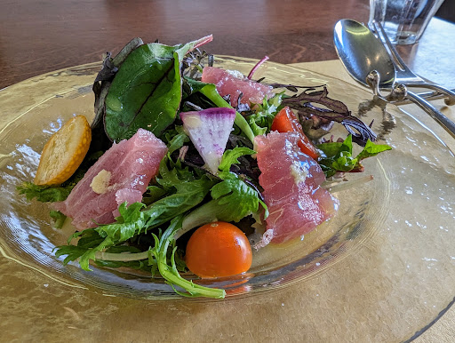 この日のカルパッチョはカジキマグロ。 金柑やトマト、葉物野菜、ハーブなどいろいろな味が楽しめます。