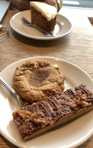 We really liked the selection of drinks and sweets. The environment is also really nice and it’s good that they have a private Wi-Fi and power outlets. However, there are only about 4 tables with power outlets (the two closest to the entrance, and the ones on the far right and left, next to the walls). We went there to get some work done so we needed outlets and Wi-Fi, and although it was very busy, it didn’t take long until the tables with the outlets became available. People come and go so you don’t really have to wait for long. Unfortunately, when we went (after lunch time), most of our chosen drinks were sold out and they had to ask us to choose a replacement. Even the less fancy options are pretty expensive, so prepare for that. I like that they have organic and healthier options. Carrot cake could be moister, but I feel like it’s a genera problem for carrot cakes in Japan 😂 (why tho?) The pecan bar and the snickerdoodle cookie were really excellent.
