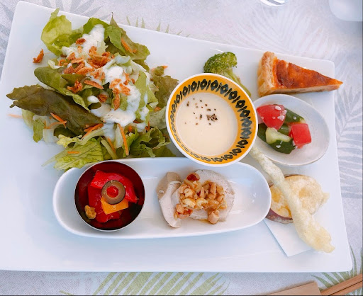 前菜はワンプレートに盛りだくさん品があり、その中でもポタージュとむね肉のナッツ添えが美味しかったです。ビザもどちらもとても美味しかったです。