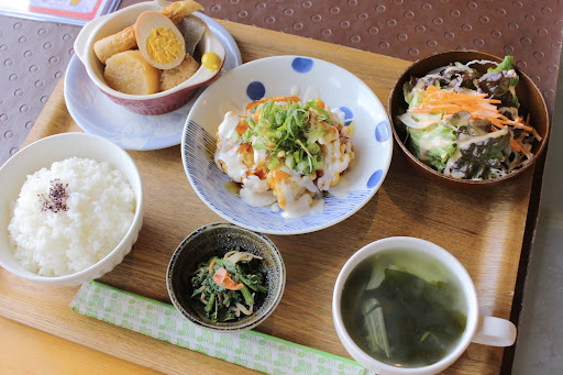 11〜14時までの週替わりランチは数量限定。メインとサブのおかず、小鉢にサラダ、スープにドリンクまでついて1,000円。丁寧に作られていてボリュームがあり、かなりお得だ。お米は京丹波産「きぬひかり」で、食材にもこだわっている。 14時以降は少し割高になるがチョイスランチがあり、遅めランチも大丈夫だ。